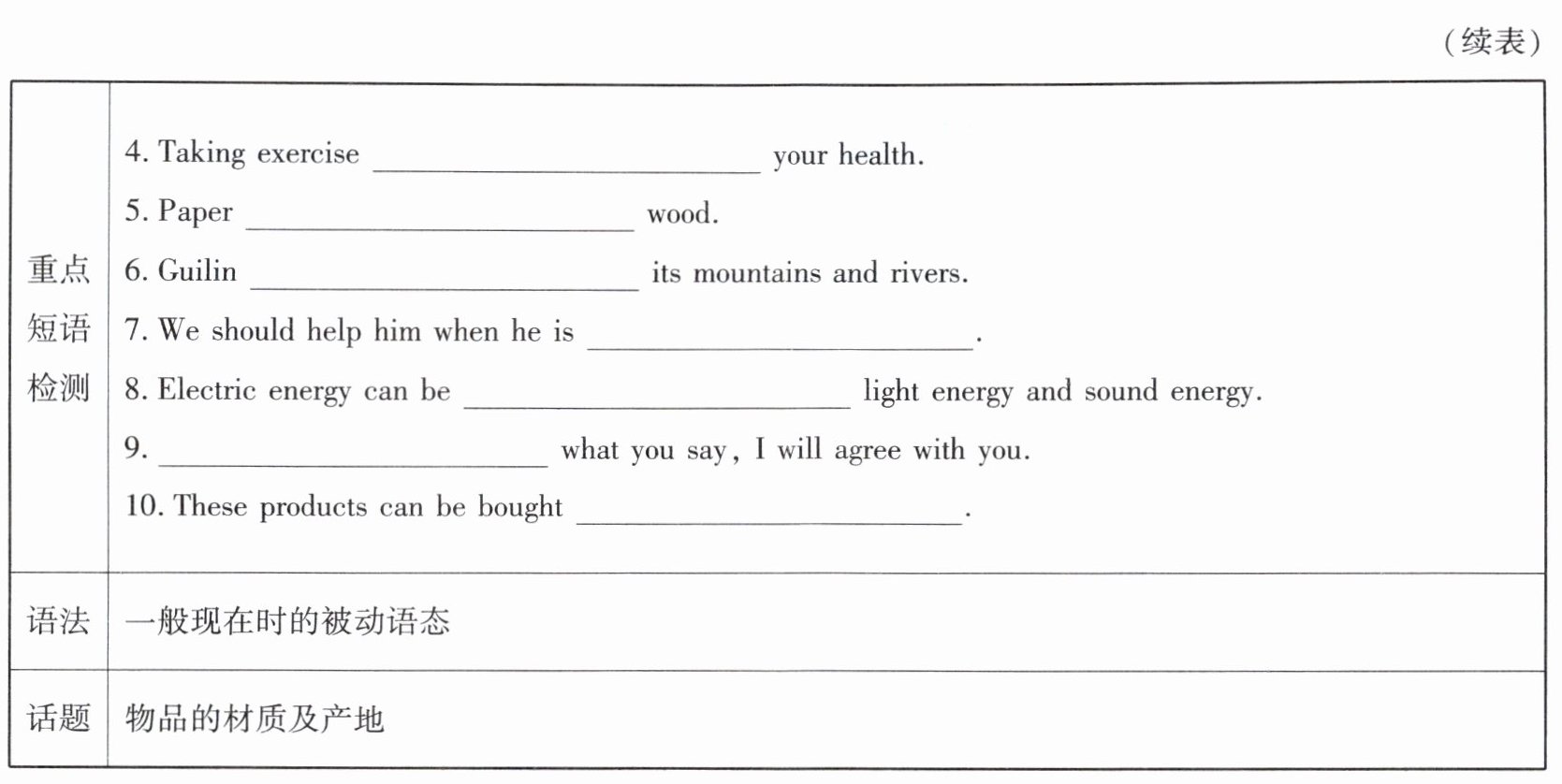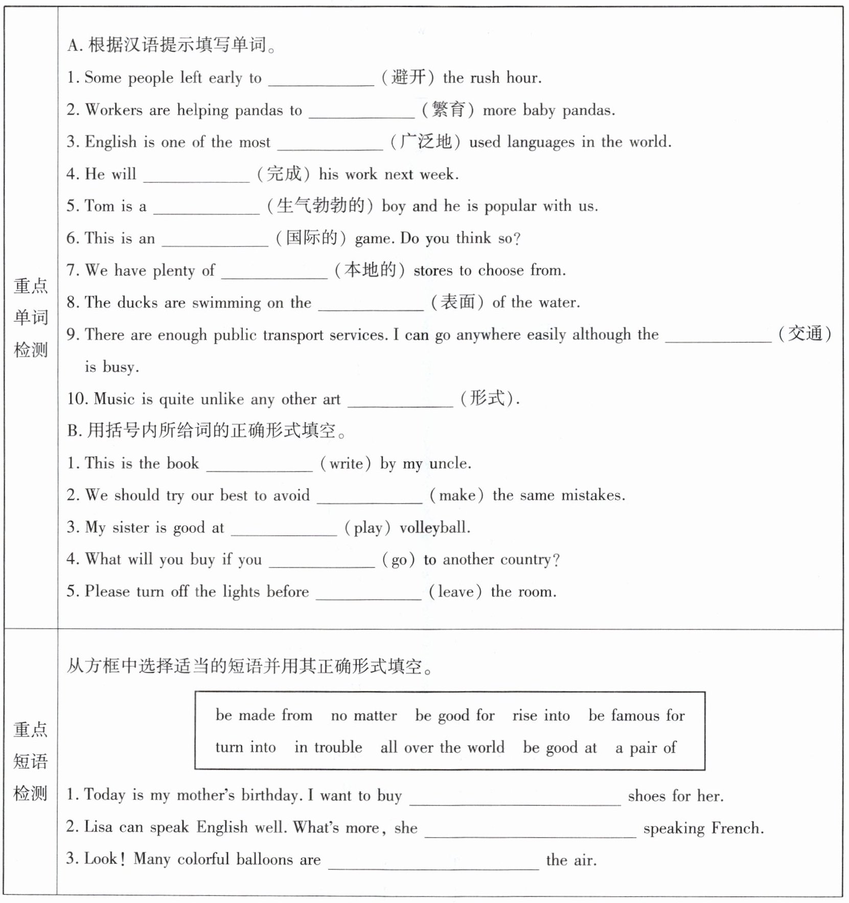 重点单词检测:A. 1. avoid 2. produce 3. widely 4. complete 5. lively 6. international 7. local 8. surface 9. traffic 10. form;B. 1. written 2. making 3. playing 4. go 5. leaving;重点短语检测:1. a pair of 2. is good at 3. rising into 4. is good for 5. is made from 6. is famous for 7. in trouble 8. turned into 9. No matter 10. all over the world;