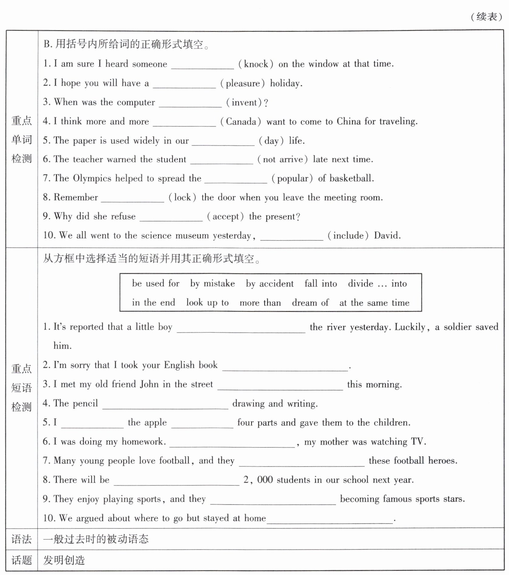 1. fell into 2. by mistake 3. by accident 4. is used for 5. divided; into 6. At the same time 7. look up to 8. more than 9. dream of 10. in the end