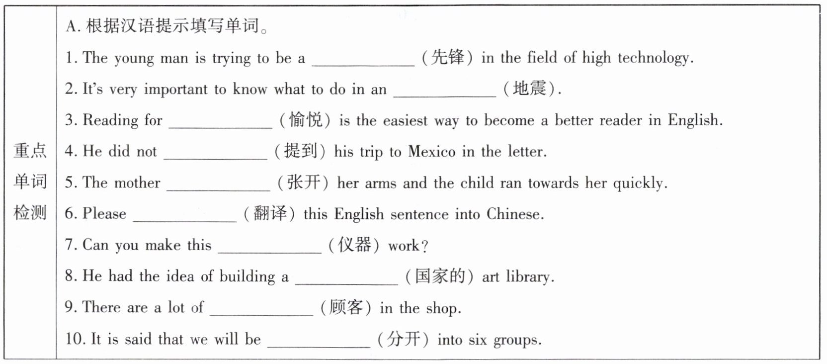 A. 1. pioneer 2. earthquake 3. pleasure 4. mention 5. spread 6. translate 7. instrument 8. national 9. customers 10. divided