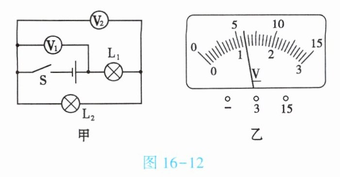 6. (★★★)如图 16 - 12 甲所示的电路图中,闭合开关 S 后,两个电压表指针偏转情况均如图 16 - 12 乙所示,则灯$ L_1、$$L_2 $两端的电压分别为【