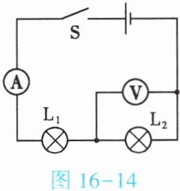 8. (★★★)如图 16 - 14 所示的电路图中,当开关 S 闭合后,灯$ L_1、$$L_2 $均能发光,电流表和电压表均有示数。过一会儿,两灯都不发光了,电流表、电压表的示数均变为零,则可能发生的故障是【