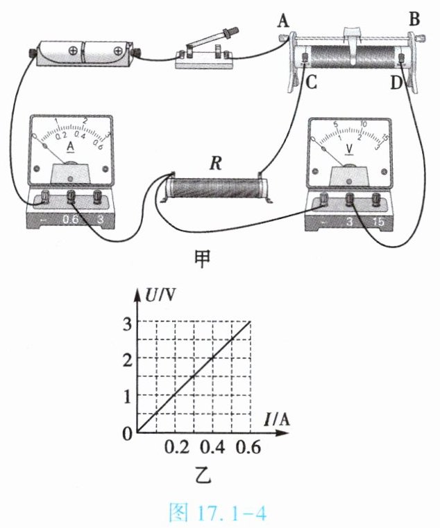 (2)电路改正后,开始进行实验,小明根据测出的数据,画出了定值电阻的 $ U - I $ 图像,如图 17.1 - 4 乙所示,由图像可以得出结论:______。为了使结论更具有普遍性,小明还应该______。