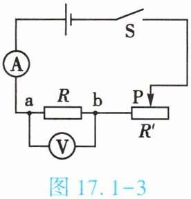 4. (★★)(双选)如图 17.1 - 3 所示,在“探究电压一定时电流与电阻的关系”时,电源电压恒为 3 V,实验中准备了电阻分别为 5 Ω、10 Ω、20 Ω 的电阻器,当将 10 Ω 的电阻器接入 a、b 间时,调节滑动变阻器,使电压表的示数为 2 V,再分别用 5 Ω、20 Ω 的电阻器替换 10 Ω 的电阻器进行实验。下列说法正确的是【