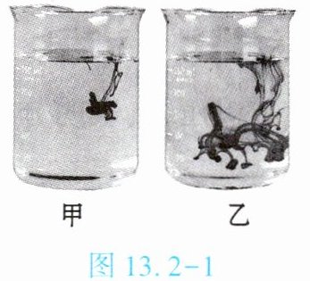 2. (★★)甲、乙两个相同的烧杯中盛有质量相同、温度不同的水,其中一杯是 $60^{\circ}C$ 的热水,另一杯是 $15^{\circ}C$ 的冷水,它们都静静地放置在水平桌面上。同时向两个烧杯中分别滴入一滴碳素墨水,过几分钟后观察到如图 13.2 - 1 所示的现象。