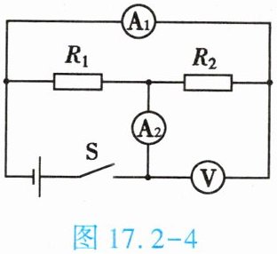 7. (★★★)如图 17.2 - 4 所示,电源电压不变,一个电阻器的电阻 $ R_2 = 4 \Omega $,闭合开关 S,小明在实验过程中仅记录了三只电表的示数,分别为 1、4、5,但漏记了单位。关于所用电源的电压和另一个电阻器的电阻 $ R_1 $,下列判断正确的是【