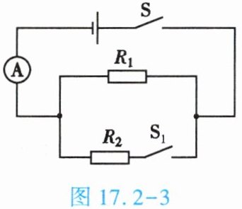 5. (★★★)如图 17.2 - 3 所示,电源电压恒定,一个电阻器的电阻 $ R_1 = 20 \Omega $。闭合开关 S,断开开关 $ S_1 $,电流表示数是 0.3 A;若再闭合开关 $ S_1 $,发现电流表示数变化了 0.2 A,则电源电压为