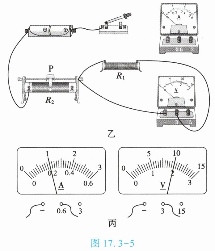 (1)按图17.3-5甲所示的电路图,将图17.3-5乙中的电流表正确连入电路。