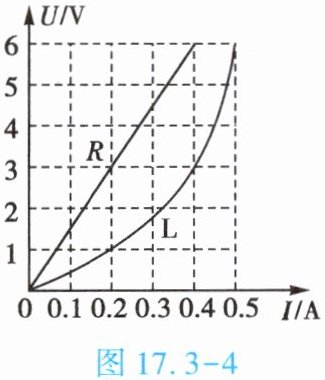 4. (★★★)如图17.3-4所示为测电阻后绘制的灯泡L和电阻为R的定值电阻的U-I图像,若将灯泡和定值电阻并联在电源电压为6V的电路中,则整个电路的总电流为