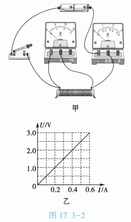 。改正后,小明增加了滑动变阻器,经过多次测量,并用所测得的数据绘出如图17.3-2乙所示的图像,该待测电阻器的电阻为5