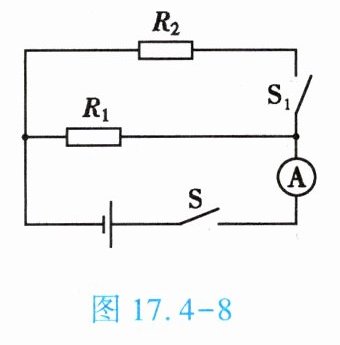 8. (★★★)如图 17.4 - 8 所示,一个电阻器的电阻 $ R_1 $ 为 $ 15\ \Omega $,电源电压保持 $ 6\ V $ 不变,电流表的测量范围为 $ 0~0.6\ A $。求: