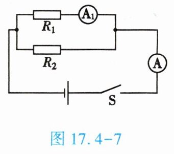 7. (★★★)如图 17.4 - 7 所示,一个定值电阻的电阻 $ R_2 = 10\ \Omega $,闭合开关 $ S $,电流表 $ A_1 $ 的示数 $ I_1 = 1\ A $,电流表 $ A $ 的示数 $ I = 1.5\ A $,求另一个定值电阻的电阻 $ R_1 $。