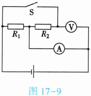 2. (★★)如图17-9所示,电源电压不变,两电阻器的电阻分别为$R_1= 10Ω、$$R_2= 20Ω。$当开关S断开时,电流表的示数为0.6A;当开关S闭合时,电压表的示数为