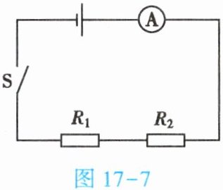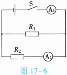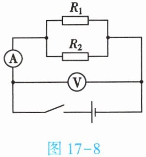 7. (★★★)如图17-8所示的电路图中,闭合开关,电流表的示数为0.6A,一个电阻器的电阻$R_2$为20Ω,通过它的电流为0.4A,求: