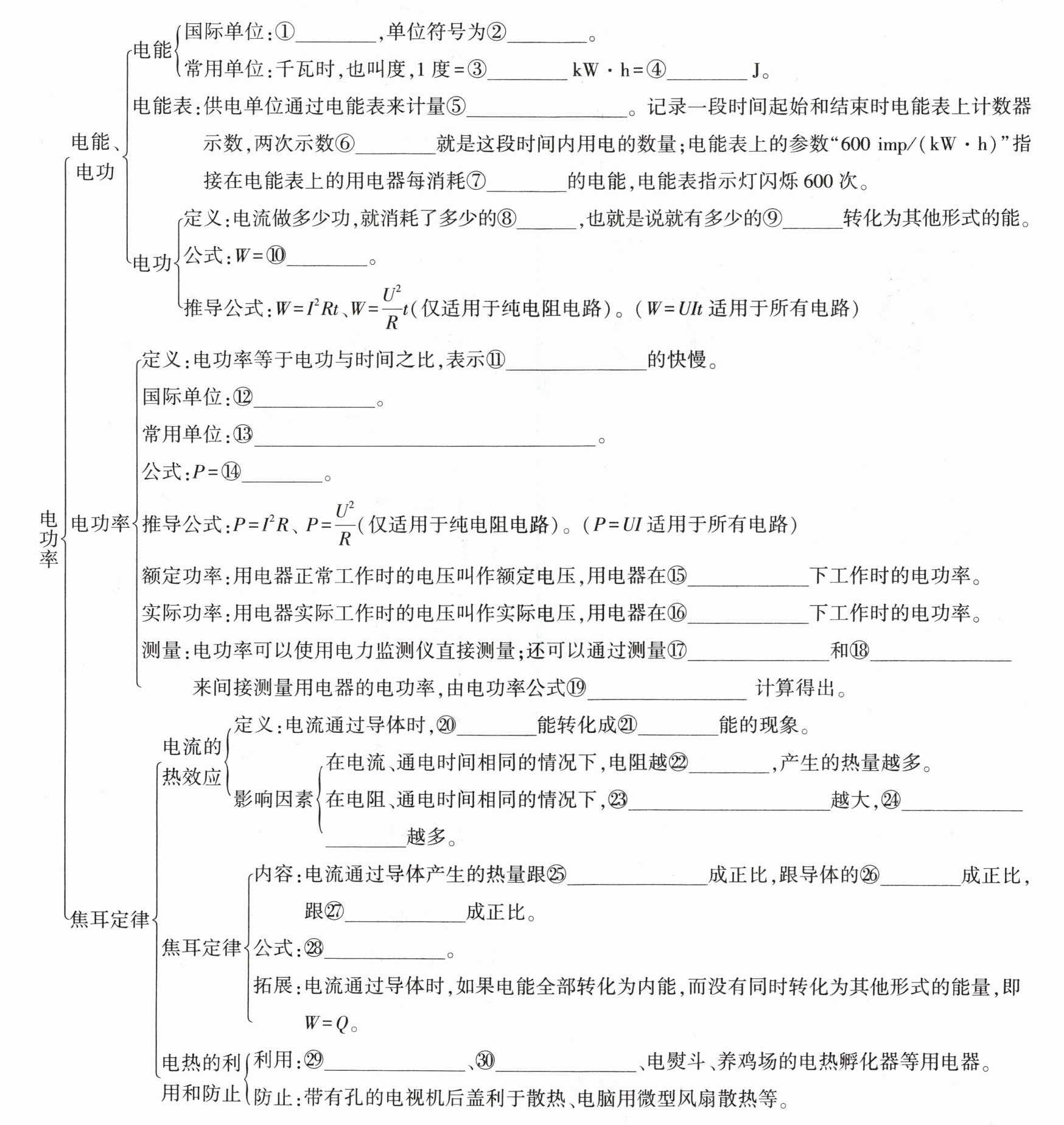 ①焦耳 ②J ③1 ④3.6×10⁶ ⑤每家消耗的电能 ⑥之差 ⑦1kW·h ⑧电能 ⑨电能 ⑩UIt ⑪电流做功 ⑫瓦特(W) ⑬千瓦(kW)、兆瓦(MW)、毫瓦(mW) ⑭UI ⑮额定电压 ⑯实际电压 ⑰用电器两端的电压 ⑱通过用电器的电流 ⑲P=UI ⑳电 ㉑内 ㉒大 ㉓通过电阻器的电流 ㉔产生的热量 ㉕电流的二次方 ㉖电阻 ㉗通电时间 ㉘Q=I²Rt ㉙电热水器 ㉚电饭锅