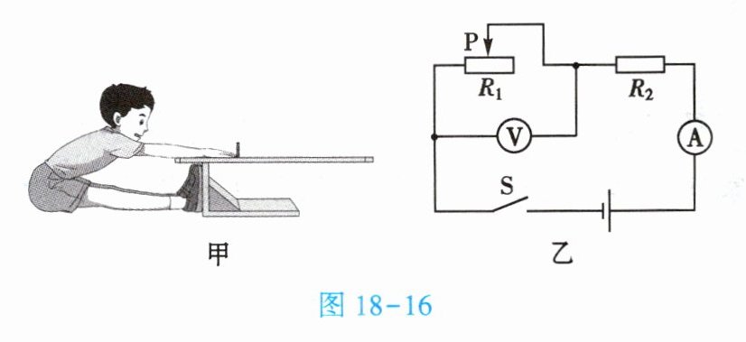 13. (★★★)(2024·内江)如图 18 - 16 甲所示是某物理兴趣小组设计的简易“坐位体前屈”测试仪,其简化原理如图 18 - 16 乙所示。在测试中,测试的同学向前水平推动测试仪的滑块(相当于向右移动图 18 - 16 乙中滑动变阻器的滑片 P),用电压表的示数来反映被测试者的成绩。电源的电压恒为 6 V,电压表的测量范围为 0~3 V,电流表的测量范围为 0~0.6 A,滑动变阻器(电阻为$ R_1)$标有“20 Ω 1.5 A”的字样,定值电阻的电阻$ R_2 = 10 Ω。$闭合开关 S,求: