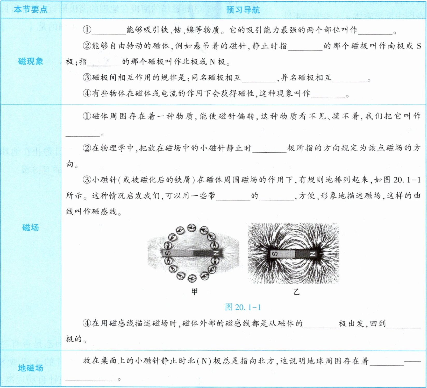 磁现象:①磁体 磁极 ②南 北 ③排斥 吸引 ④磁化 磁场:①磁场 ②N(或北) ③箭头 曲线 ④N S 地磁场:磁场 地磁场