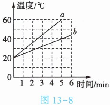 5. (★★)(2024·烟台)在探究“物质的吸热能力与哪些因素有关”的实验中,用质量是0.3kg的水和下表中等质量的另一种物质进行对比,作出的图像如图13-8所示。实验过程中,水和另一种物质在相同时间内吸收的热量相等,分析图像可以得出,图线____(填“a”或“b”)对应的物质为水,另一种物质为____,这种物质在0~5min内吸收的热量为____J。