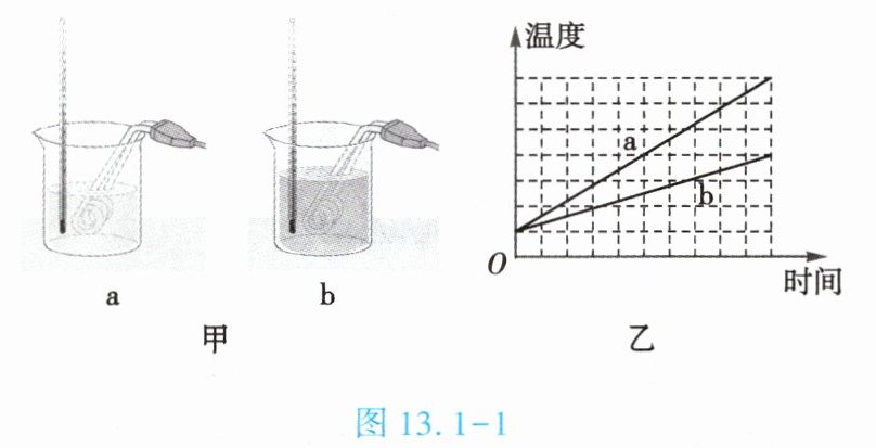 2. (★★)如图 13.1 - 1 甲所示,利用相同规格的加热器加热等质量的 a、b 两种液体,得到温度随时间变化的图像,如图 13.1 - 1 乙。分析可知【