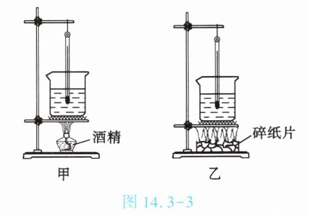 4. (★★)为比较酒精和碎纸片这两种燃料的热值,小明采用如图14.3-3甲、乙所示的装置进行实验:他将一定质量的酒精和碎纸片分别放入两个燃烧皿中点燃,分别给装有质量相等的水的两个相同烧杯加热,直至酒精和碎纸片完全燃烧。