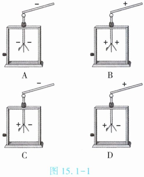 2. (★★)用毛皮摩擦橡胶棒使其带电,再用橡胶棒接触不带电的验电器,图15.1-1中能正确表示橡胶棒和验电器金属箔带电情况的是【
