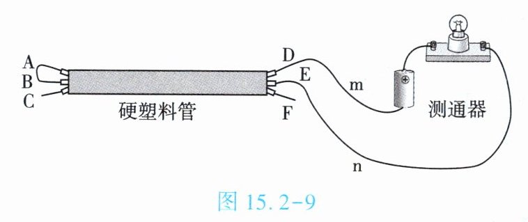 9. (★★★)如图15.2-9所示,一根硬塑料管内穿有三根完全相同的电线,为了辨别哪两个线头为同一根电线的两端,连接A和B,将测通器的m连接在D上,当n连接E时小灯泡不发光,n连接F时小灯泡仍不发光。由此可以确定为同一电线两端的是【