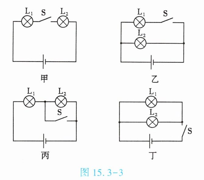 3. (★★)如图 15.3 - 3 所示的电路图中,开关 $ S $ 能使 $ L_1 $ 和 $ L_2 $ 同时发光或熄灭的是【