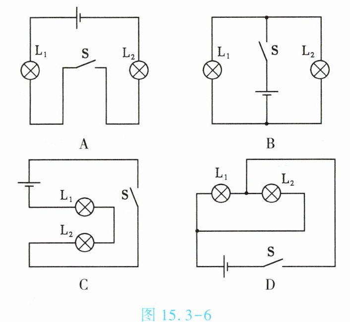 1. (★★)(双选)在图 15.3 - 6 所示的电路图中,闭合开关 $ S $,小灯泡 $ L_1 $、$ L_2 $ 串联的是【