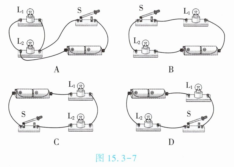 2. (★★)在如图 15.3 - 7 所示的电路中,闭合开关 $ S $,小灯泡 $ L_1 $、$ L_2 $ 并联的是【