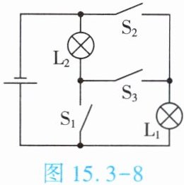 3. (★★★)在图 15.3 - 8 所示的电路图中,有三个开关 $ S_1 $、$ S_2 $ 和 $ S_3 $,如果仅将开关 $ S_3 $ 闭合,$ S_1 $、$ S_2 $ 断开,则小灯泡 $ L_1 $、$ L_2 $