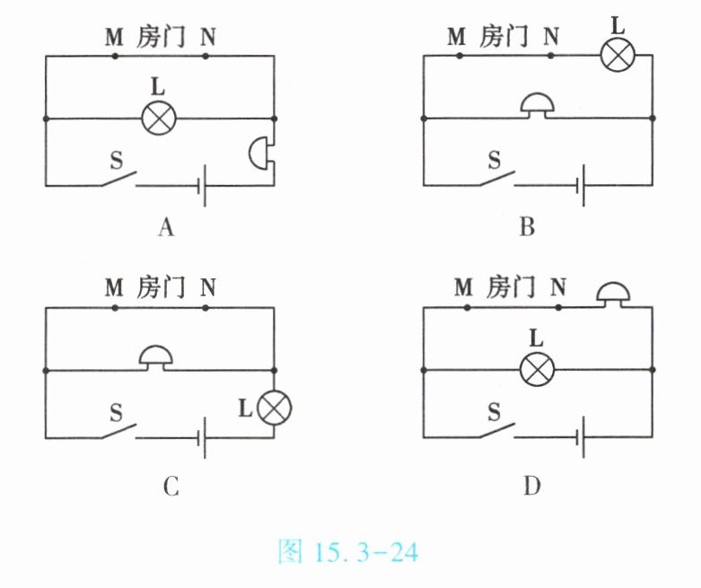 9. (★★★)(2025·苏州)小明要设计自动防盗报警电路。要求:开关 S 闭合后,灯亮、电铃不响;当房门被打开时,细导线 MN 被扯断,灯亮且电铃响。图 15.3 - 24 所示电路图中,符合设计要求的是【