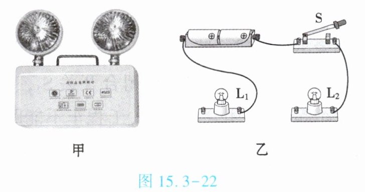 7. (★★★)图 15.3 - 22 甲是一款学校常用的应急照明灯,当外部电路停电时两个应急灯都发光。两个应急灯都正在发光时,小宁看到工人师傅将学校应急灯中的任意一个灯泡拧下,而另一个灯泡仍然发光。根据以上现象,小宁画出了这款应急照明灯的部分电路,如图 15.3 - 22 乙所示,请你用笔画线表示导线把图乙的电路连接完整。