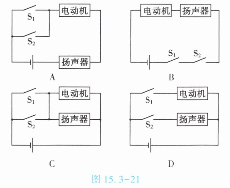 6. (★★★)消防安全关系到千万家庭的幸福生活,为此欢欢设计了一款防火门,火灾发生时智能开关$ S_1 $会自动闭合,开关$ S_2 $可以人为闭合,任意一个开关闭合都可以让电动机关闭防火门,同时扬声器进行报警。电动机和扬声器的工作互不影响,图 15.3 - 21 中电路图能够实现的是【