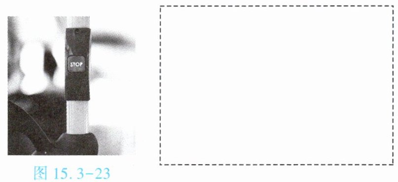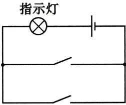 8. (★★★)如图 15.3 - 23 所示,某市公交车后门的两个扶杆上均装有一个按钮,两个按钮都相当于一个开关。当乘客按下任一按钮,驾驶台上的指示灯亮,提醒司机有人下车。请你在虚线框内画出这个电路图。