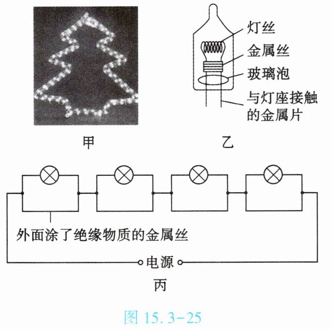 (填“串联”或“并联”)一条金属丝(如图 15.3 - 25 乙所示),与灯丝两端连接的金属丝的外面涂了一层绝缘物质(如图 15.3 - 25 丙所示)。当串联在电路中的小彩灯正常发光时,金属丝与灯丝是绝缘的,不会导通灯丝的两端,对电路起不到任何作用。而当某只小彩灯的灯丝烧断时,其他小彩灯瞬间会熄灭,同时导致这个小彩灯的绝缘金属丝出现电火花,烧毁金属丝外面的绝缘层,这时,金属丝在电路中相当于一根导线,从而接通
