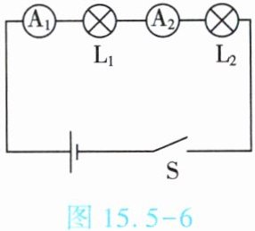 3. (★★★)小明用图 15.5 - 6 所示电路图测量电流,他发现电流表$ A_1 $和$ A_2 $的示数分别为 0.18 A 和 0.16 A,为什么两个电流表示数不同呢?小明认为电流先到达$ A_1,$经过灯$ L_1 $时被消耗了一些,因此到达$ A_2 $时会少一些。为了验证他的猜想是否正确,以下操作不可行的是【