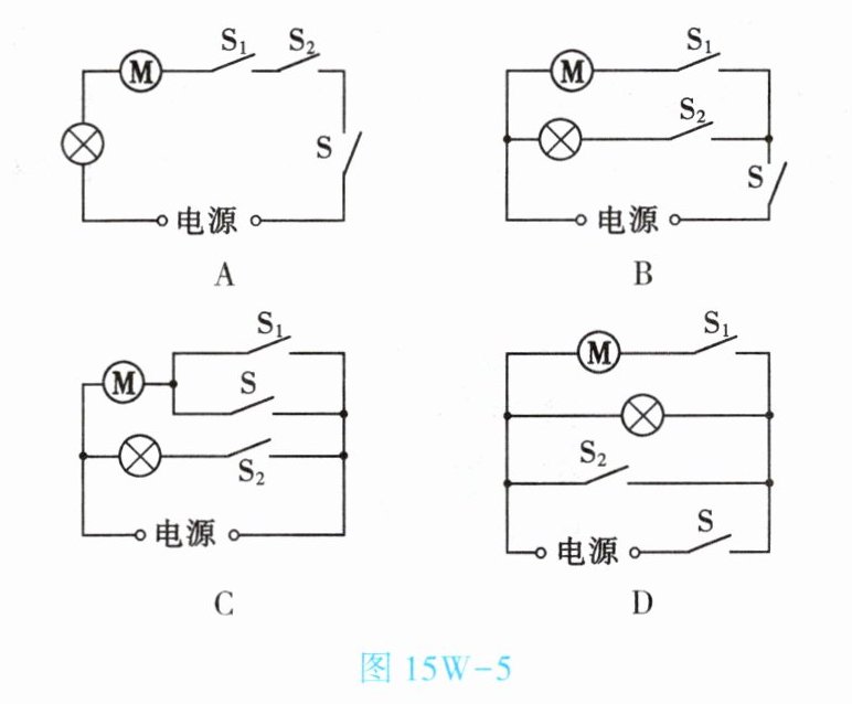 6. (★★)(2025·威海)某智能家居系统设计要求:当呼唤系统时,整个系统做好工作准备(相当于闭合开关 S);当发出语音“拉开窗帘”(相当于闭合开关$ S_1),$电动机工作拉开窗帘;当发出语音“打开台灯”(相当于闭合开关$ S_2),$台灯工作。图 15W - 5 所示电路图中,设计符合要求的是【