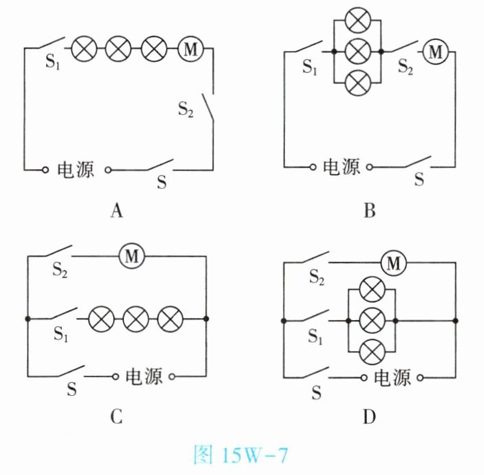 7. (★★)如图 15W - 6 所示为一款吊扇灯,由一个电动机和三个灯泡组合而成,闭合总开关 S 后,再闭合开关$ S_1,$三个灯泡都亮且互不影响,然后闭合开关$ S_2,$电动机开始工作。图 15W - 7 所示电路图中符合实际的是【