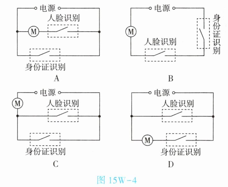 5. (★★)乘坐高速列车可直接刷身份证进站,闸机口通过人脸识别系统确保“人”“证”一致,闸机门才打开通行。用 M 代表闸门,图 15W - 4 所示电路图可实现上述要求的是【