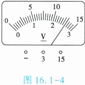 4. (★)如图16.1-4所示是实验室常用电压表的表盘,它有0~3 V和0~15 V两个测量范围。当用0~3 V时,它的分度值为