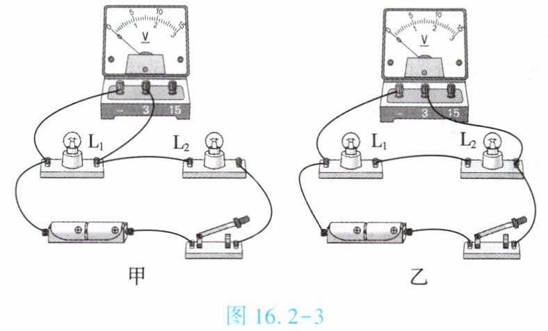 1. (★★)如图 16.2 - 3 所示,小灯泡 $ L_1 $ 和 $ L_2 $ 串联接在电源电压不变的电路中,电压表前后两次的接线不同。闭合开关后,图甲中电压表的示数为 $ 1.6 $ V,图乙中电压表的示数为 $ 2.9 $ V,则小灯泡 $ L_1 $ 两端的电压为