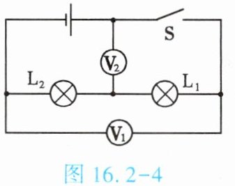 2. (★★)如图 16.2 - 4 所示的电路图中,当闭合开关 $ S $ 后,电压表 $ V_1 $、$ V_2 $ 的示数分别为 $ 4.5 $ V、$ 2.5 $ V,则小灯泡 $ L_1 $ 两端的电压为