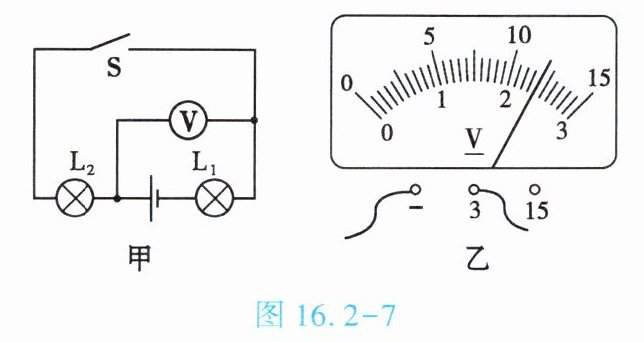 两端的电压。若电源电压是 $ 6 $ V,开关闭合后,电压表的示数如图 16.2 - 7 乙所示,则灯泡 $ L_1 $ 两端的电压是3.6