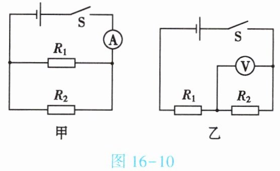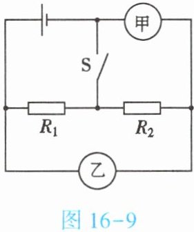 2. (★★)如图 16 - 9 所示,甲、乙是电流表或电压表,当开关 S 闭合后,要使电阻为$ R_1、$$R_2 $的两个电阻器并联,则甲是