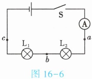 7. (★★★)小强同学在“探究串联电路中各处电流的关系”的实验中,按图 16 - 6 连接好了电路,闭合开关 S 后,观察实验现象,发现两灯均不发光。为检测出电路故障,他做了以下操作:将电压表接到 b、c 两点,观察到电压表、电流表均无示数;将电压表接到 a、b 两点,观察到电压表有明显示数,而电流表示数几乎为零。则电路故障可能是【