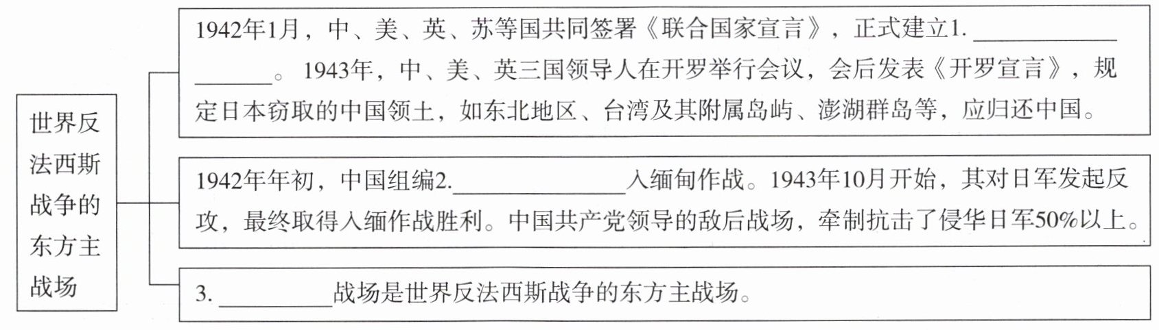 |世界反法西斯战争的东方主战场|1942年1月,中、美、英、苏等国共同签署《联合国家宣言》,正式建立1.____。1943年,中、美、英三国领导人在开罗举行会议,会后发表《开罗宣言》,规定日本窃取的中国领土,如东北地区、台湾及其附属岛屿、澎湖群岛等,应归还中国。|
