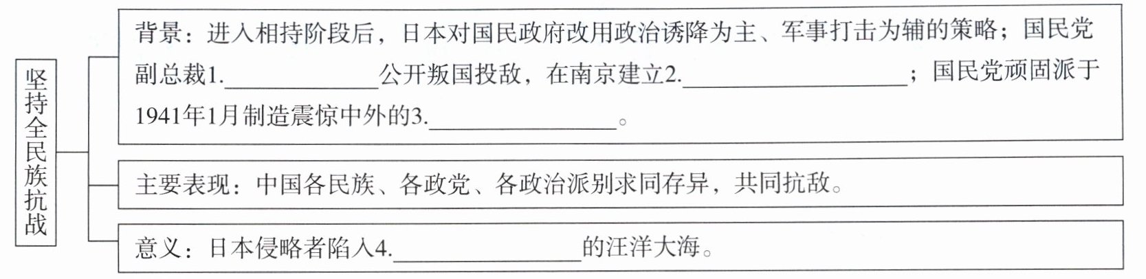 |坚持全民族抗战|背景:进入相持阶段后,日本对国民政府改用政治诱降为主、军事打击为辅的策略;国民党副总裁1.____公开叛国投敌,在南京建立2.____;国民党顽固派于1941年1月制造震惊中外的3.____。|