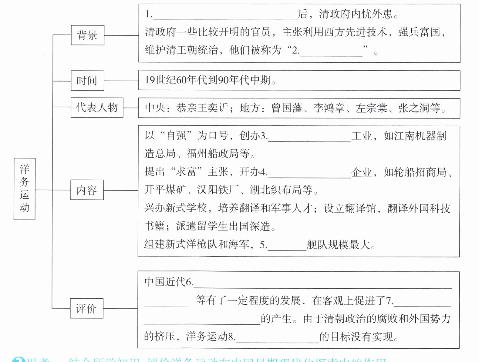 1.第二次鸦片战争 2.洋务派 3.近代军事 4.近代民用 5.北洋 6.军事工业、民用工业、交通运输业 7.中国民族资本主义 8.求强求富 思考一 洋务运动是中国现代化的首次大规模尝试,推动工业、教育等现代化,但因坚持"中体西用"而局限于技术层面,未触及制度变革,最终失败。尽管洋务运动未能实现求强求富的目标,但洋务派引进西方科技、培养近代人才,为后续变革奠定了基础。