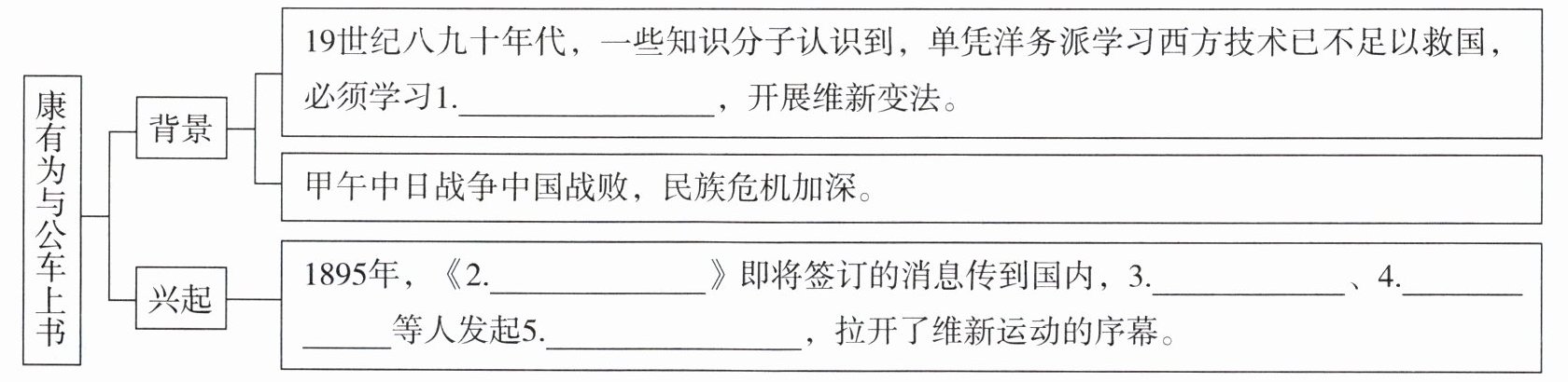 |康有为与公车上书|背景|19世纪八九十年代,一些知识分子认识到,单凭洋务派学习西方技术已不足以救国,必须学习1.______,开展维新变法。|