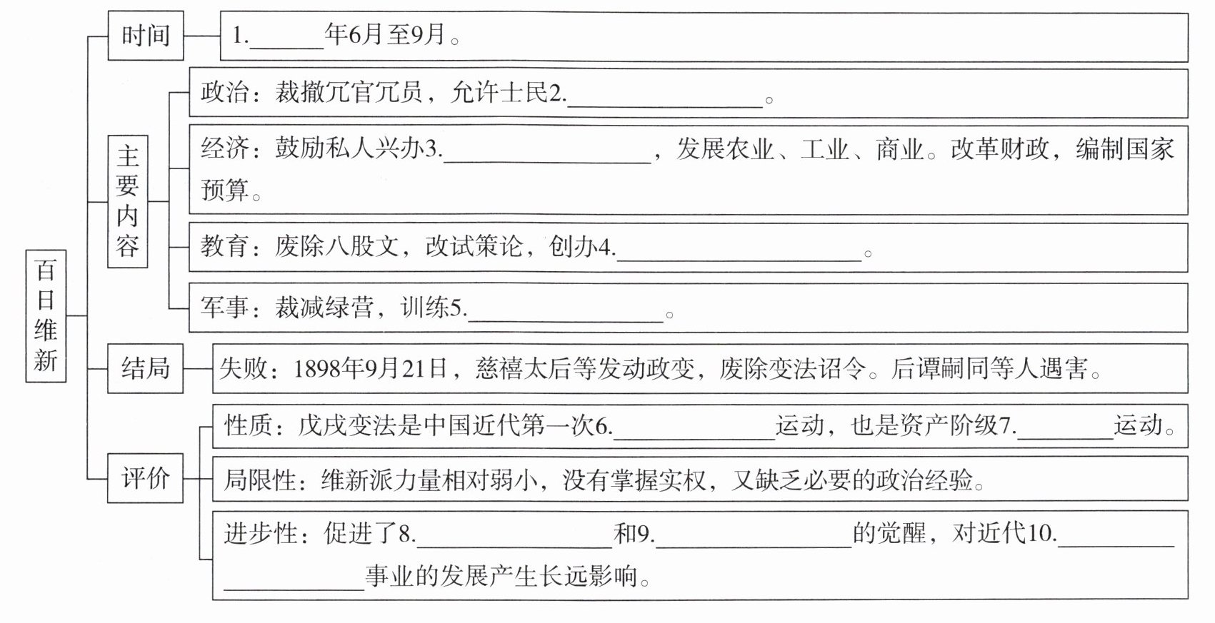 1.1898 2.上书言事 3.工矿企业 4.京师大学堂 5.新式军队 6.思想解放 7.改良 8.思想启蒙 9.民族意识 10.教育和报刊 思考二 改革需循序渐进,争取广泛支持;平衡新旧利益,避免激进措施激化矛盾;资产阶级改良道路在中国行不通。(符合题意的其他答案也可)