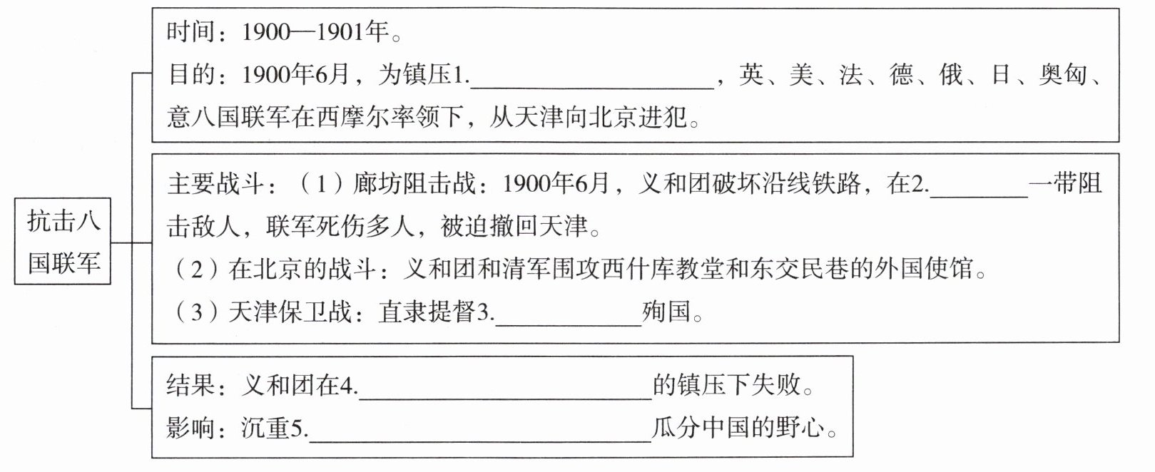 | |主要战斗:(1)廊坊阻击战:1900年6月,义和团破坏沿线铁路,在2.______一带阻击敌人,联军死伤多人,被迫撤回天津。